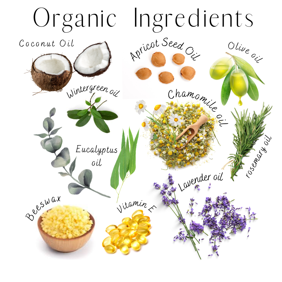Ingredientes: Olive Oil*, Lavender and Chamomile infused Apricot Kernel Oil*, Coconut Oil*, Beeswax*, Vitamin E and a calming blend of essential oils such as Eucalyptus, Lavender, Rosemary, Wintergreen and Chamomile. *Organic